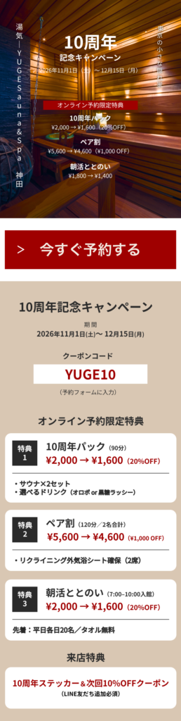 【LP制作課題】東京サウナ「湯気 – YUGE Sauna & Spa 神田」10周年記念キャンペーン予約LP